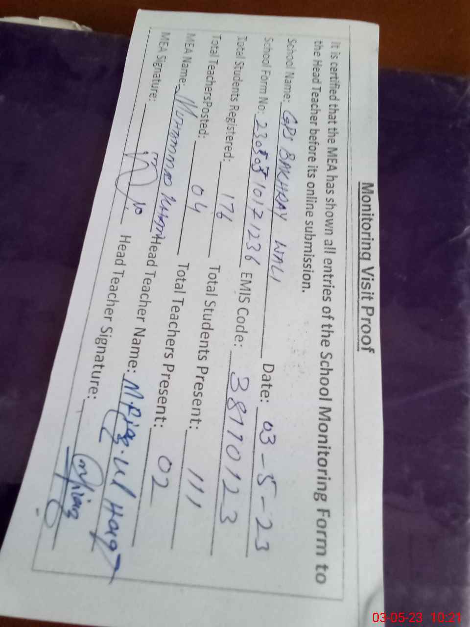| EMIS Code: 38110123 | Name of School: GPS BAKHRAY WALI | |||