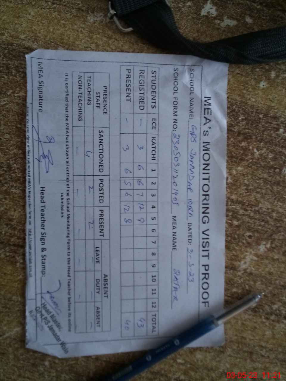 | Attendance Register | Head Teacher | MEA with School | Visit Proof |