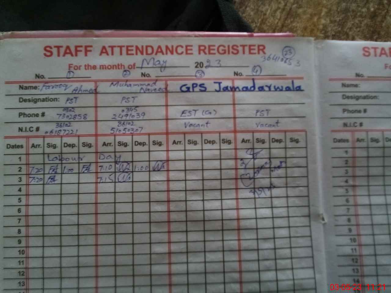 | CNIC | Full Name | Designation | R/C | Absence During Last Calender Month |