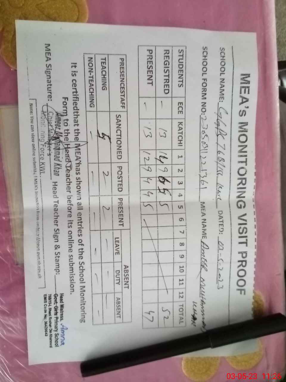| Attendance Register | Head Teacher | MEA with School | Visit Proof |