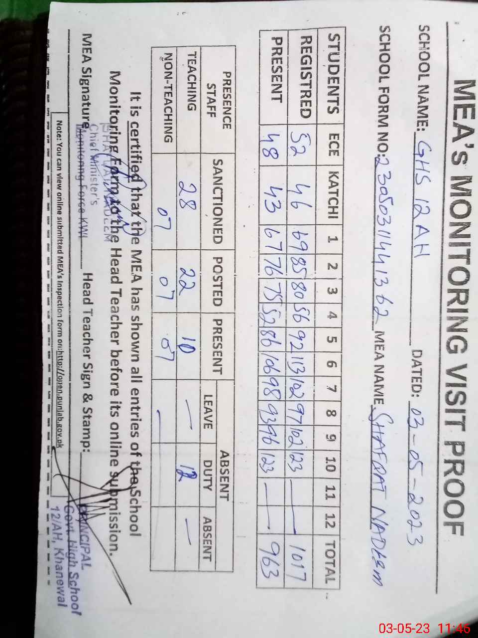 | Attendance Register | Head Teacher | MEA with School | Visit Proof |