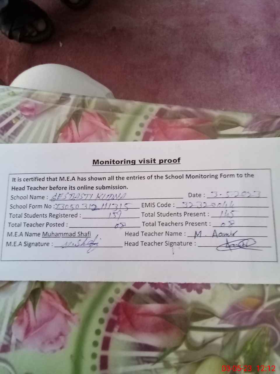 | Attendance Register | Head Teacher | MEA with School | Visit Proof |