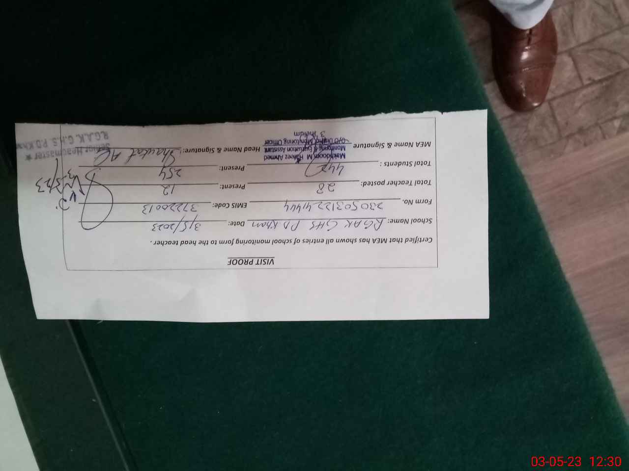 | Attendance Register | Head Teacher | MEA with School | Visit Proof |