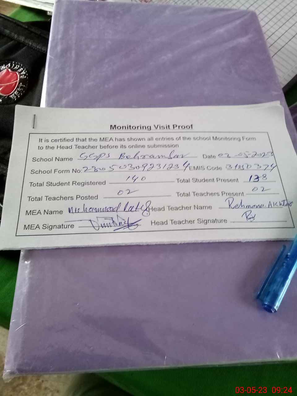 | Attendance Register | Head Teacher | MEA with School | Visit Proof |