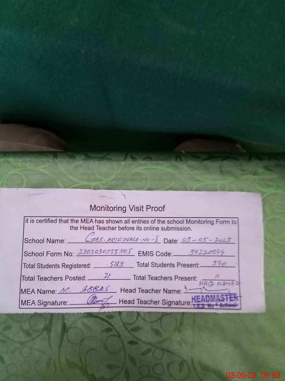 | EMIS Code: 39220044 | Name of School: GES NO. 1 ARIF WALA | |||