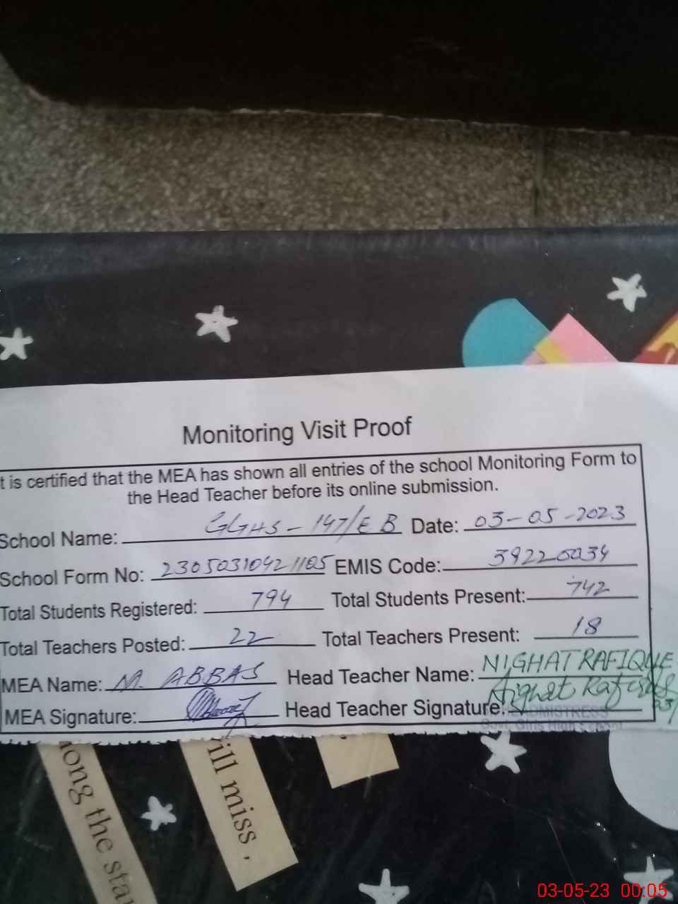 | Attendance Register | Head Teacher | MEA with School | Visit Proof |