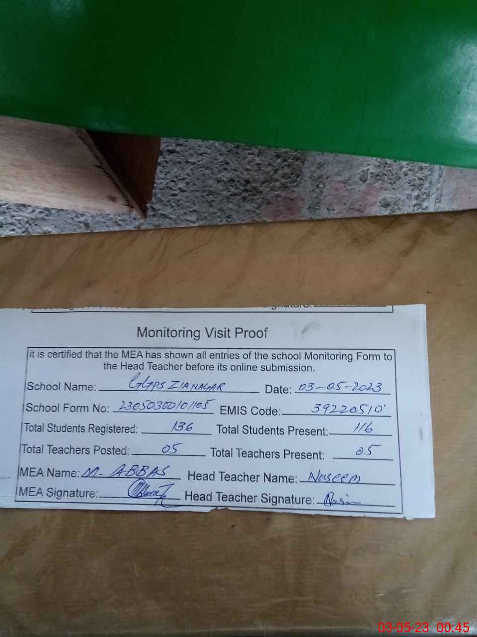 | Attendance Register | Head Teacher | MEA with School | Visit Proof |