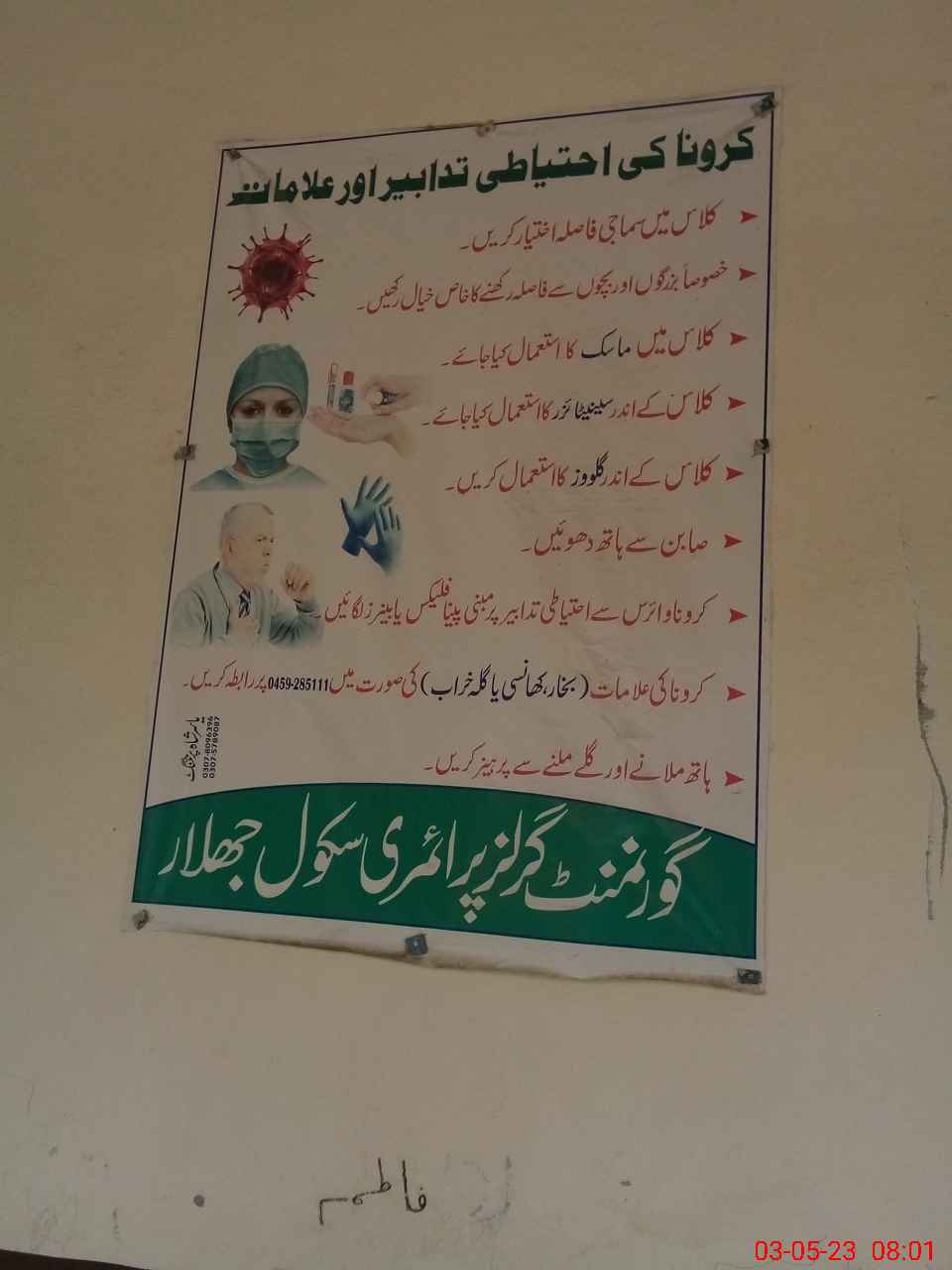 | Total no. of Classrooms: 3 No. of Classrooms Used for Teaching: 3 No. of Classrooms Storing Old Furniture, FTBs, etc: 0Comments if Any: Chokidar Naeem Ahmed is physical absent No Leave record found No soap is placed on washing point |