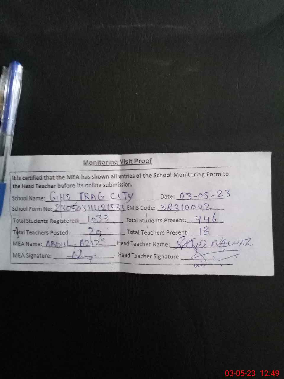 | Attendance Register | Head Teacher | MEA with School | Visit Proof |