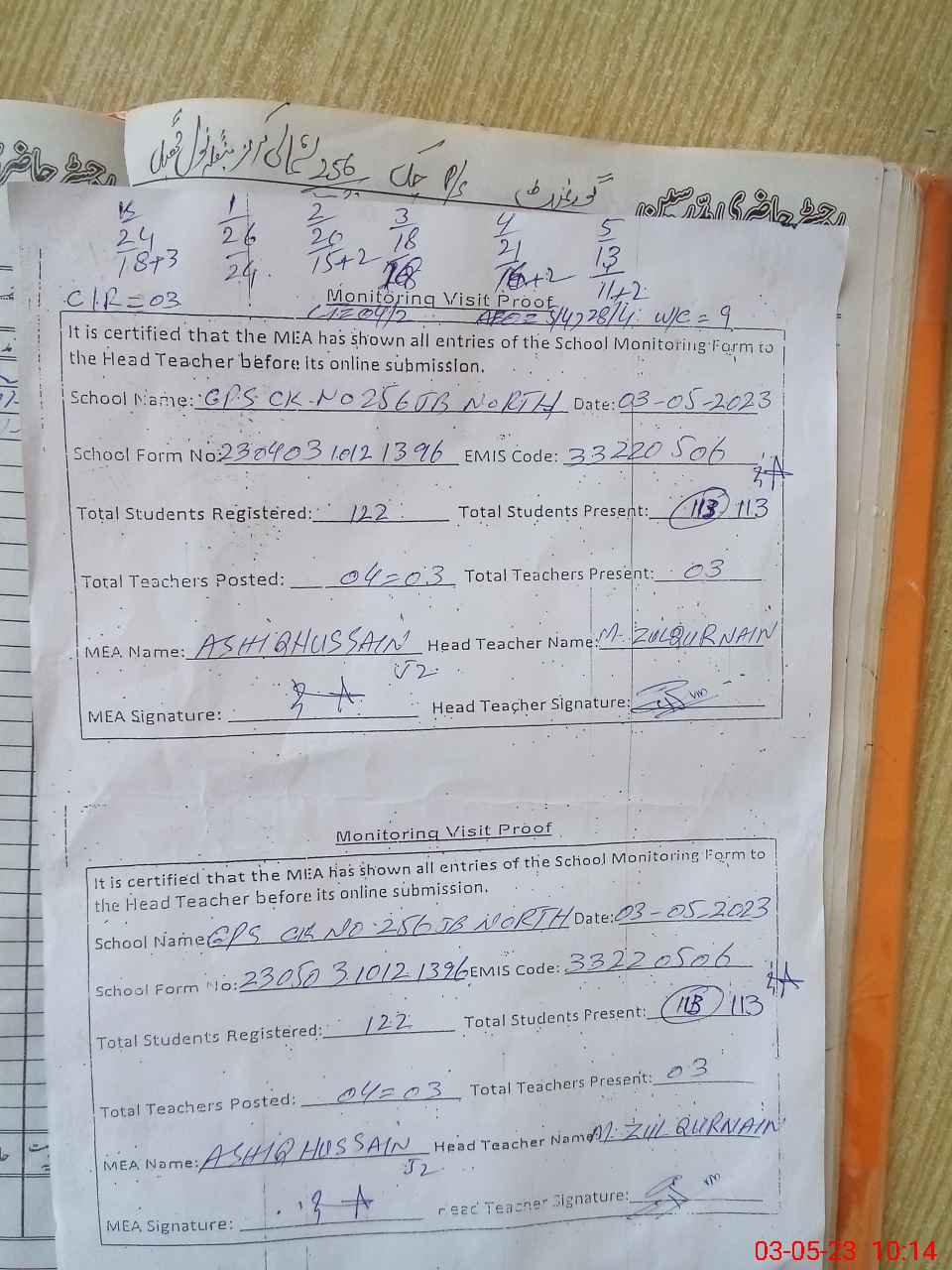 | EMIS Code: 33220506 | Name of School: GPS CHAK NO 256 JB NORTH | |||