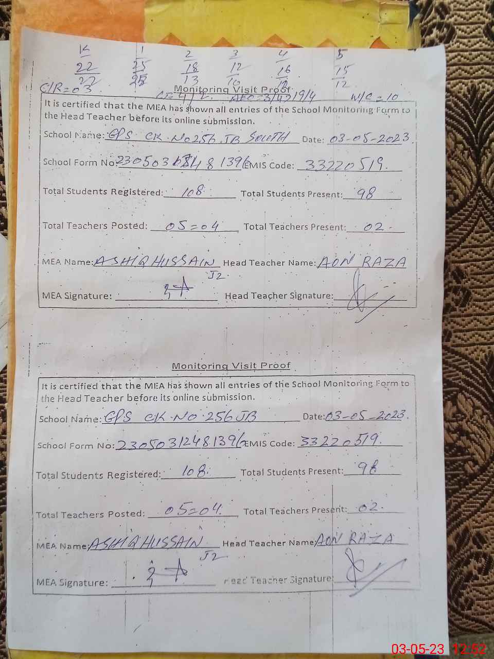 | EMIS Code: 33220519 | Name of School: GPS CHAK NO 256 JB SOUTH | |||