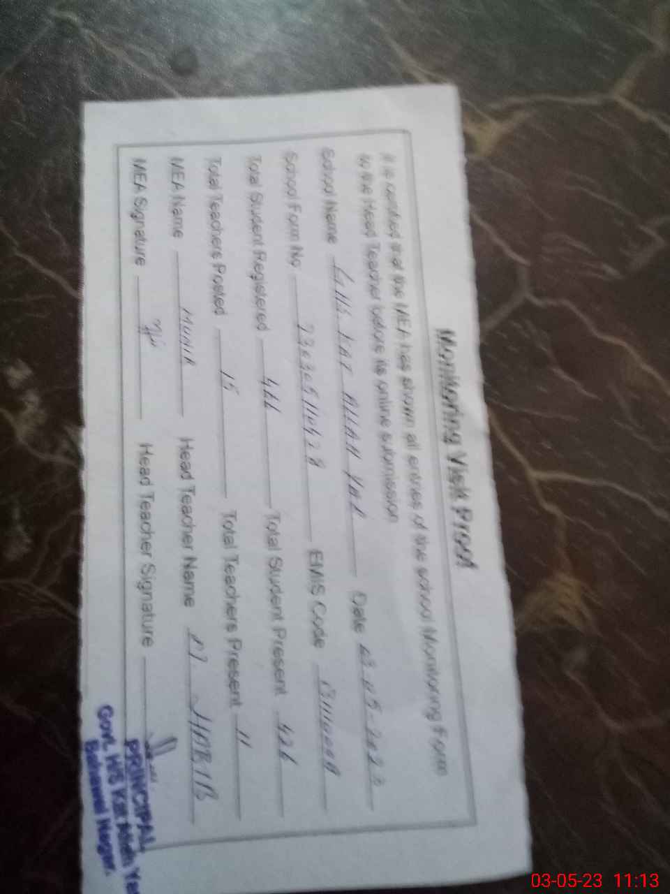 | Attendance Register | Head Teacher | MEA with School | Visit Proof |