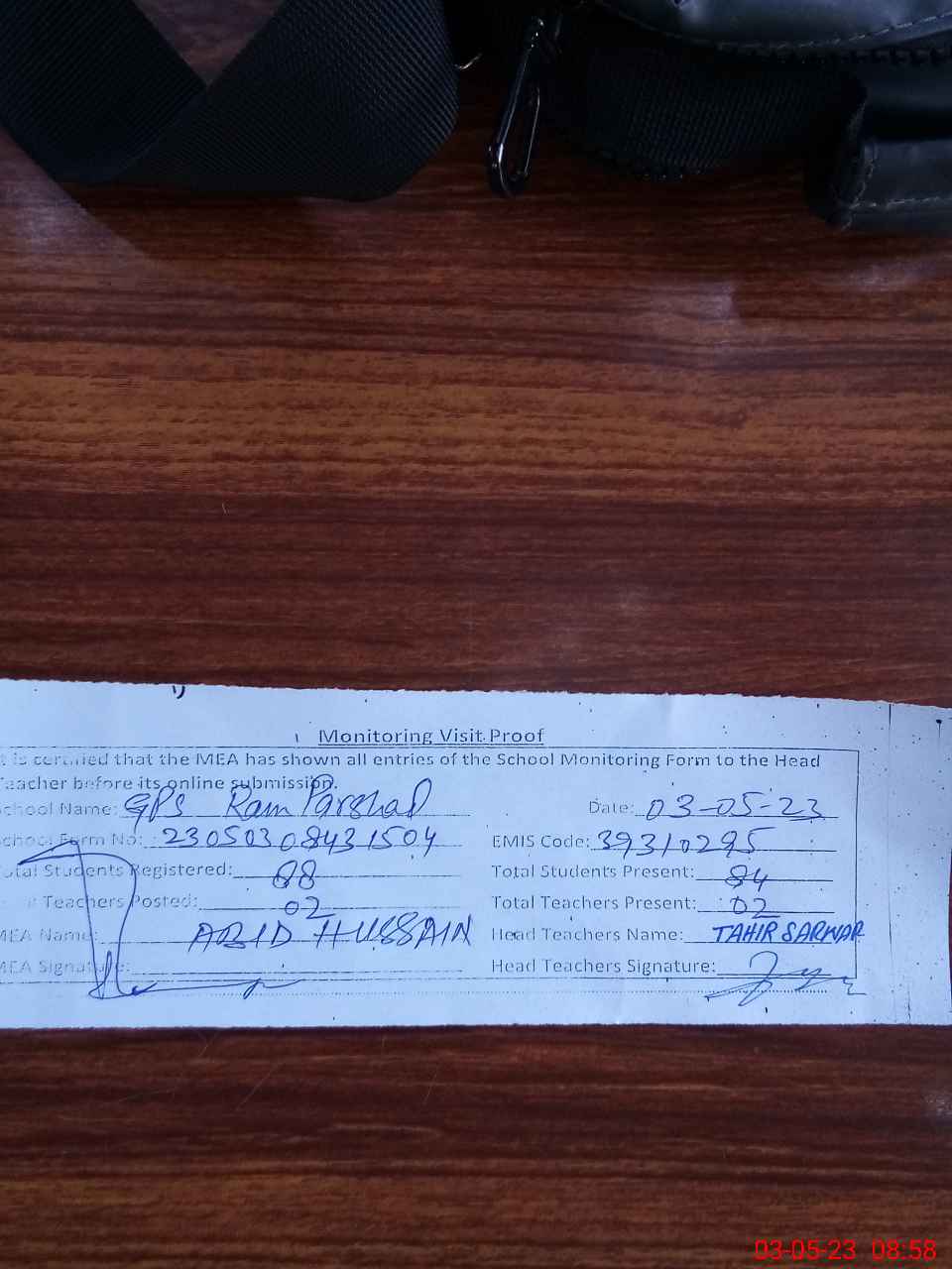 | Attendance Register | Head Teacher | MEA with School | Visit Proof |