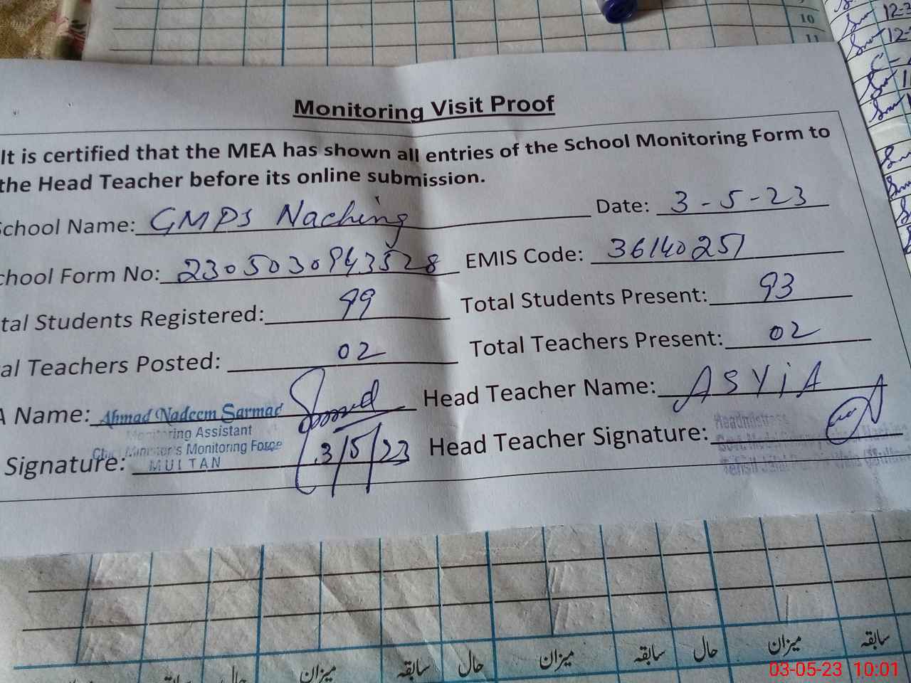 | Attendance Register | Head Teacher | MEA with School | Visit Proof |