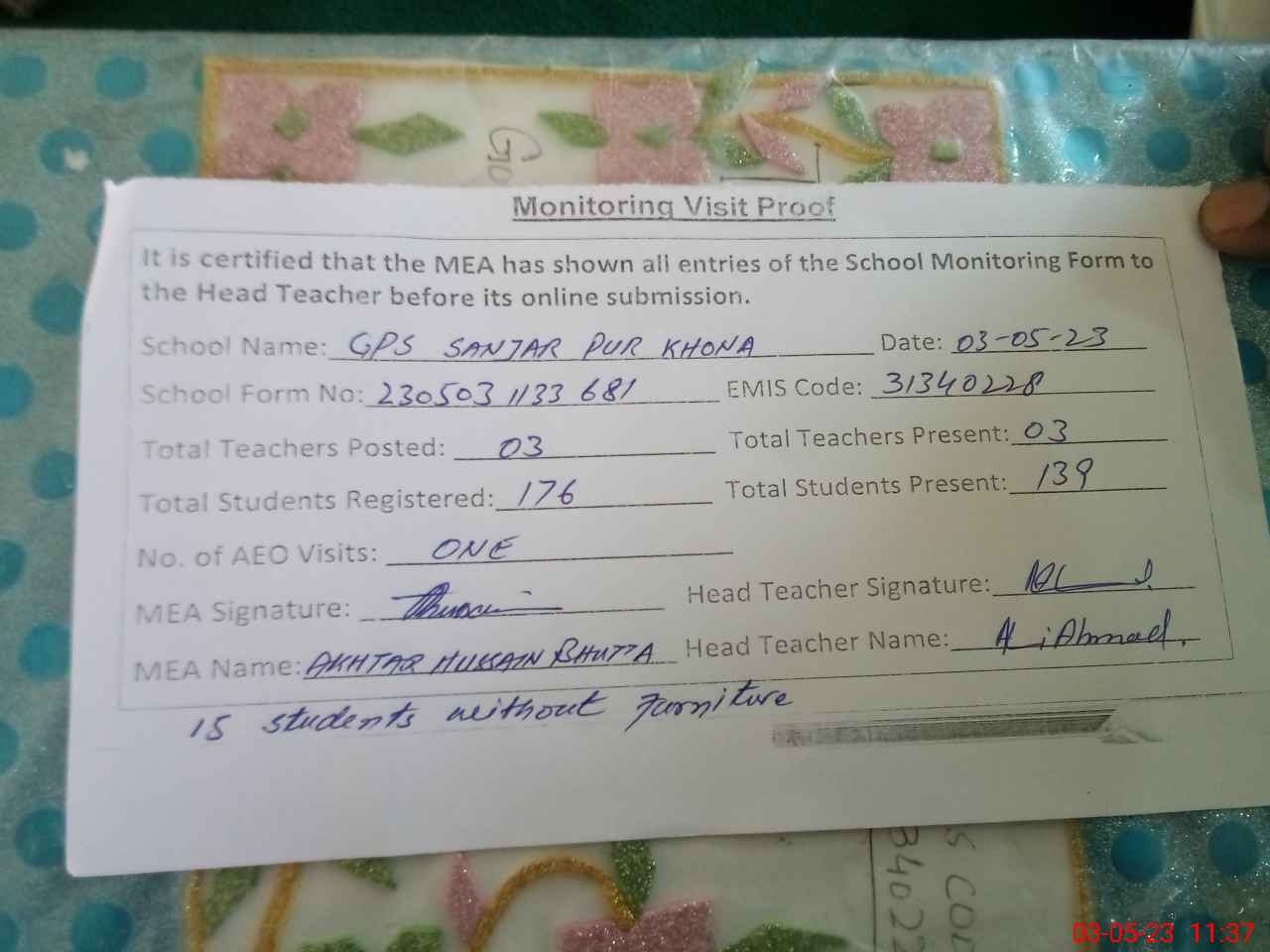 | EMIS Code: 31340228 | Name of School: GPS SANJAR PUR KHOHNA | |||