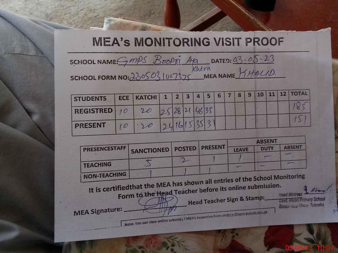 | EMIS Code: 36430400 | Name of School: GMPS BOOPRI AYA KHERA, TULAMBA | |||