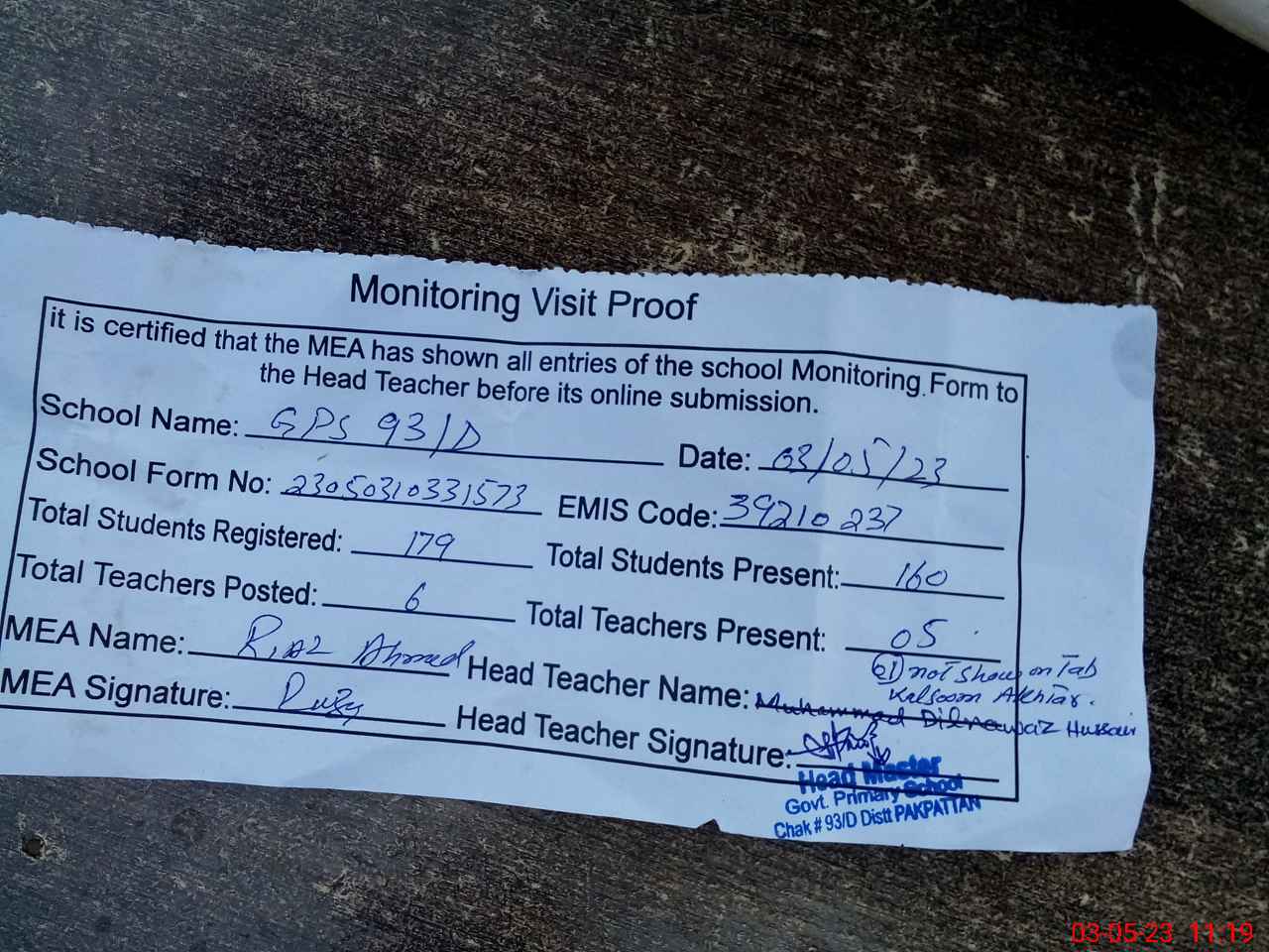 | Attendance Register | Head Teacher | MEA with School | Visit Proof |