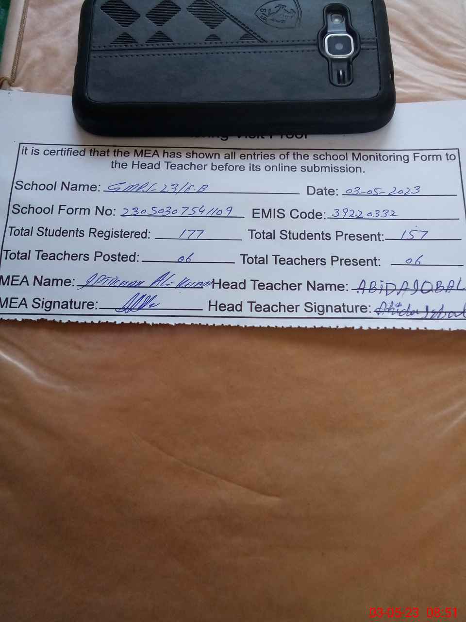 | Attendance Register | Head Teacher | MEA with School | Visit Proof |
