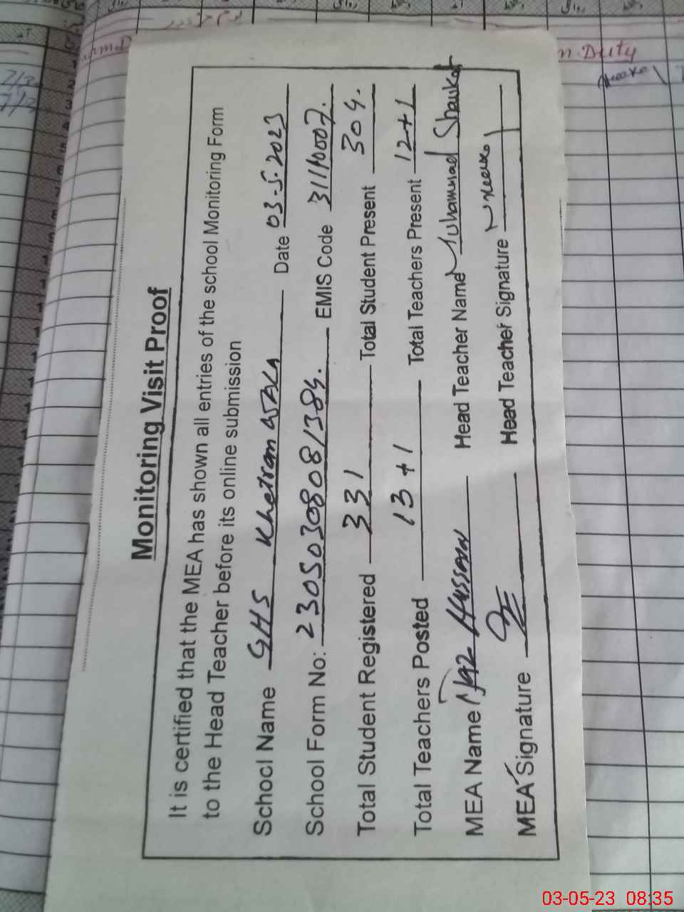 | Attendance Register | Head Teacher | MEA with School | Visit Proof |