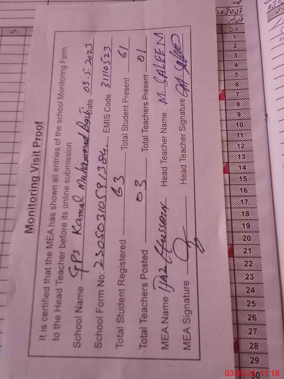 | Attendance Register | Head Teacher | MEA with School | Visit Proof |