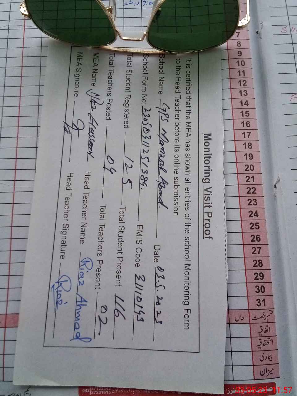 | Attendance Register | Head Teacher | MEA with School | Visit Proof |