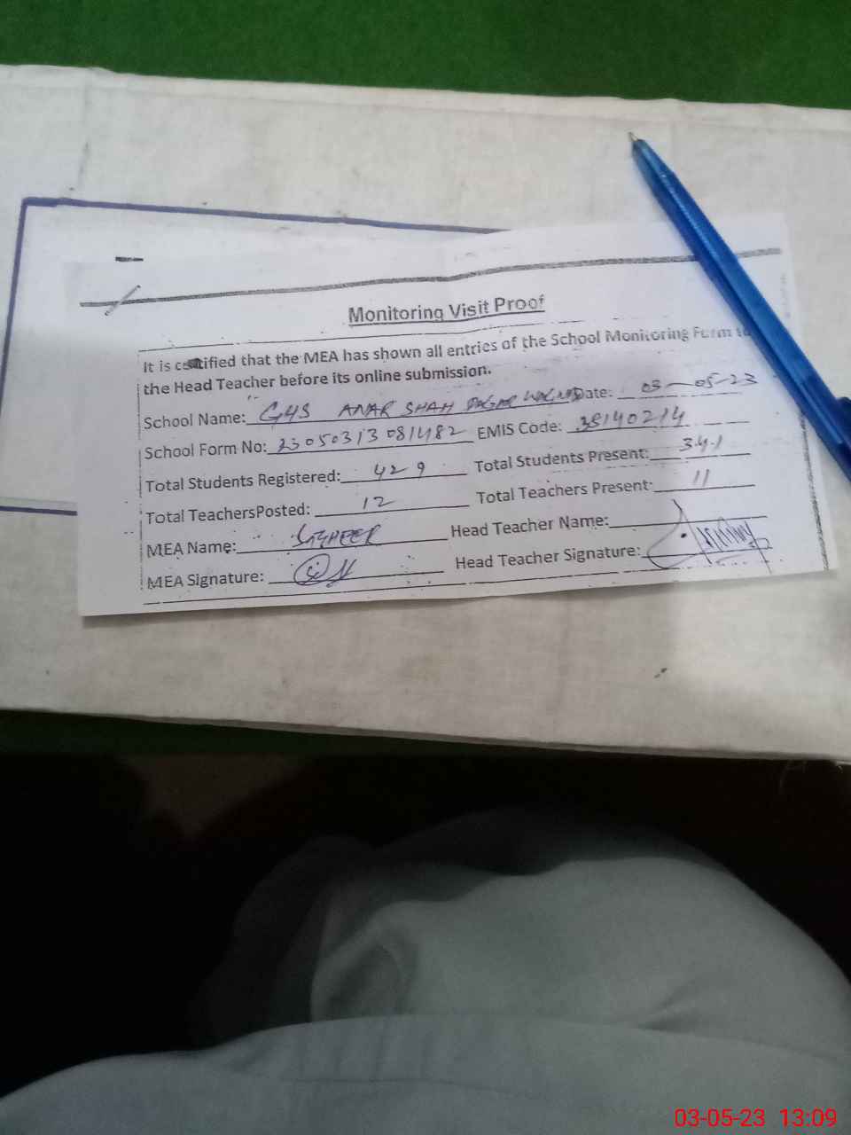 | Attendance Register | Head Teacher | MEA with School | Visit Proof |