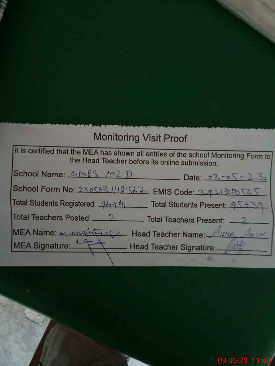 | Attendance Register | Head Teacher | MEA with School | Visit Proof |