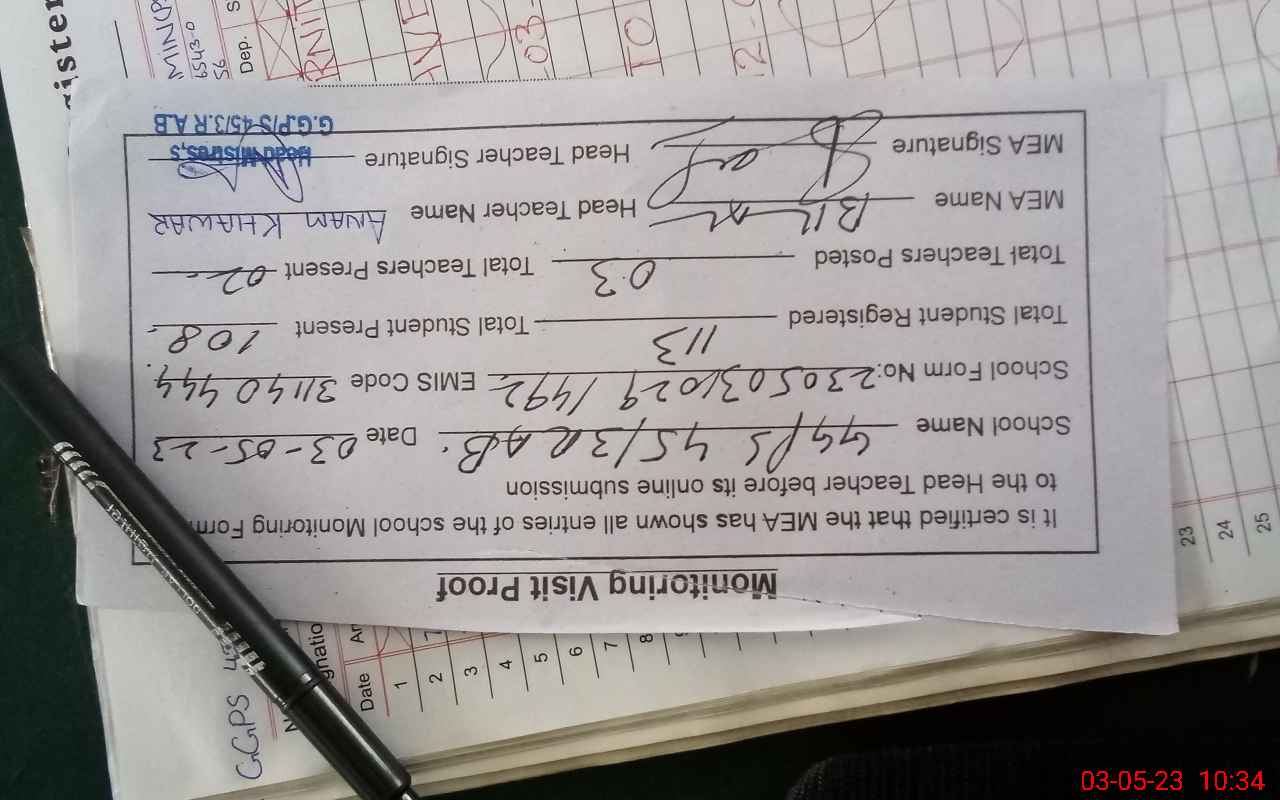 | Attendance Register | Head Teacher | MEA with School | Visit Proof |