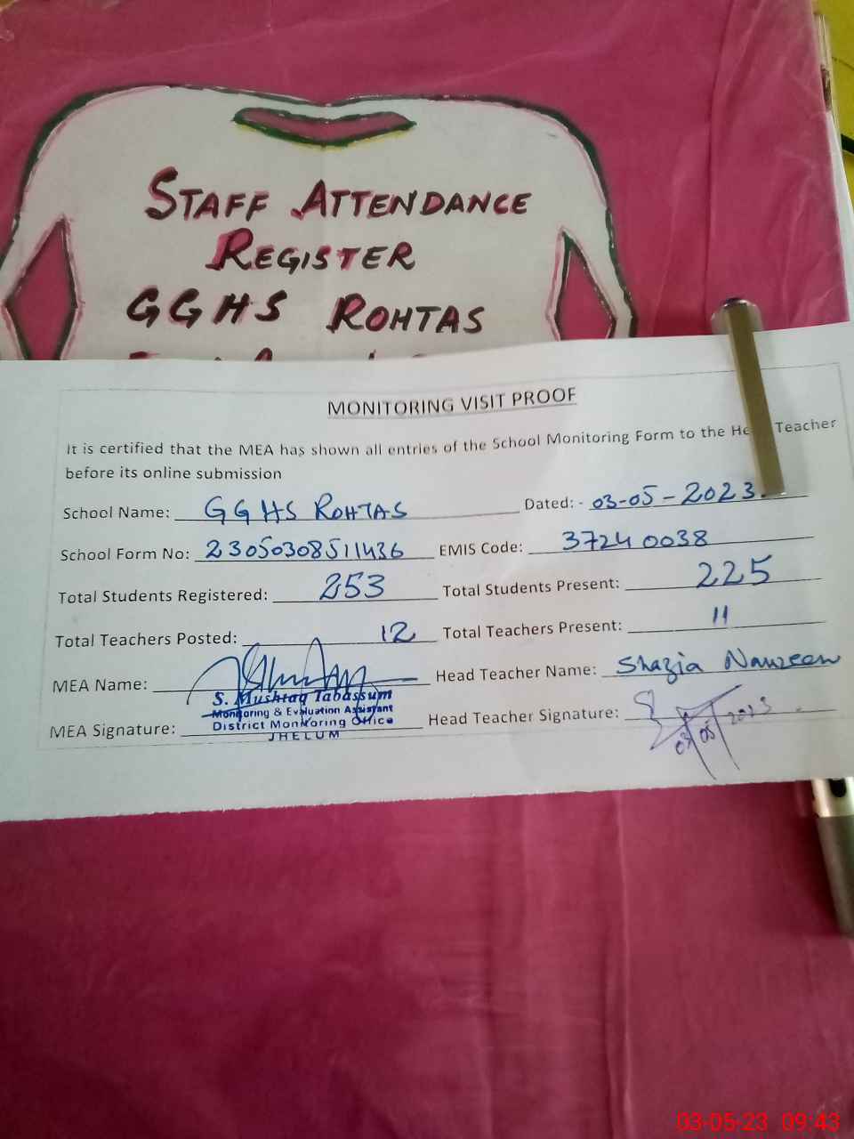 | Attendance Register | Head Teacher | MEA with School | Visit Proof |