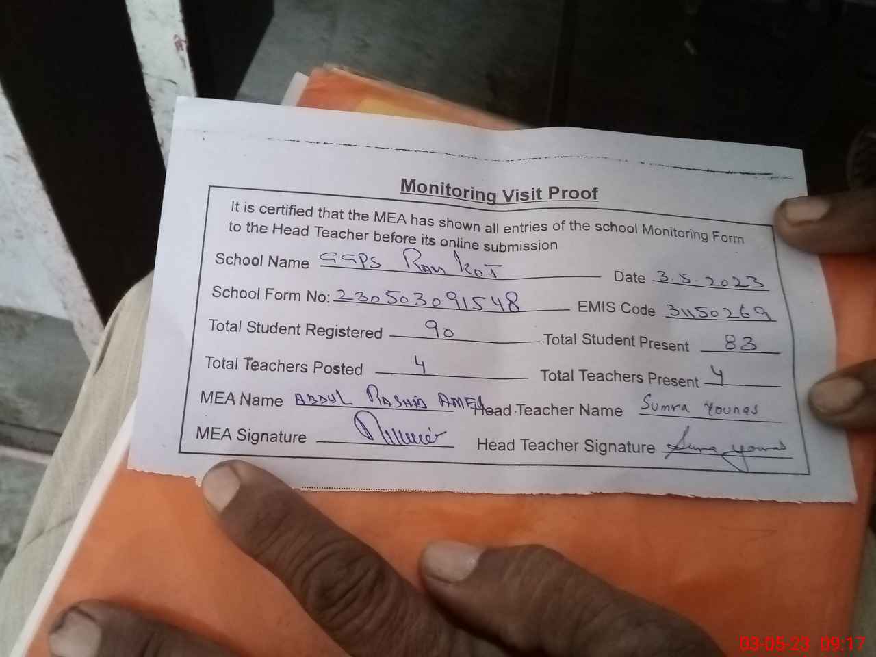 | Attendance Register | Head Teacher | MEA with School | Visit Proof |
