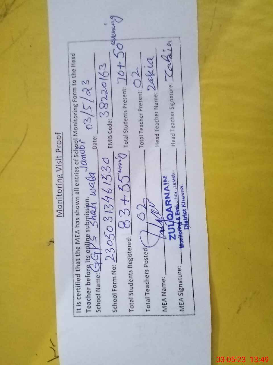 | Attendance Register | Head Teacher | MEA with School | Visit Proof |
