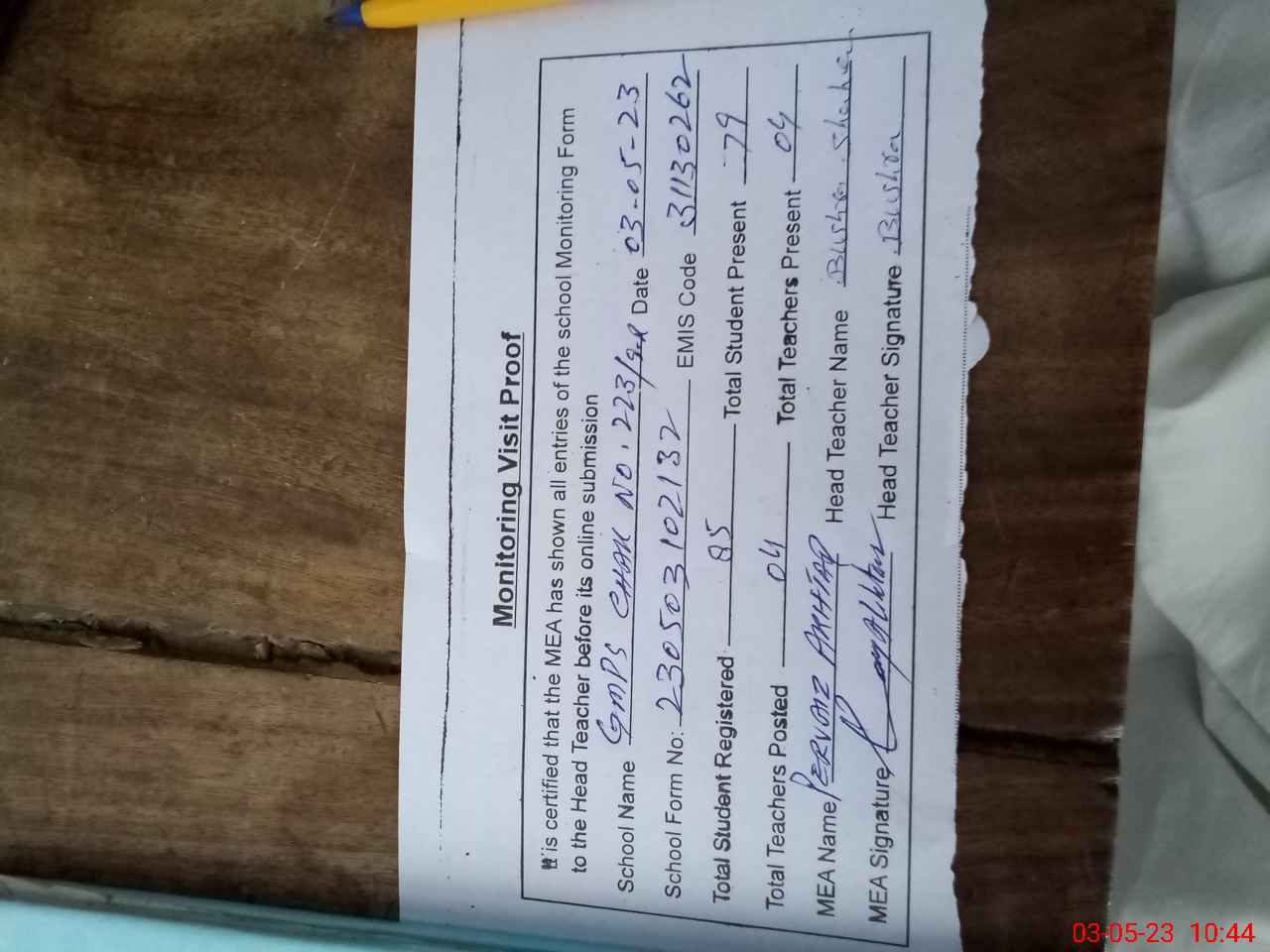 | Attendance Register | Head Teacher | MEA with School | Visit Proof |