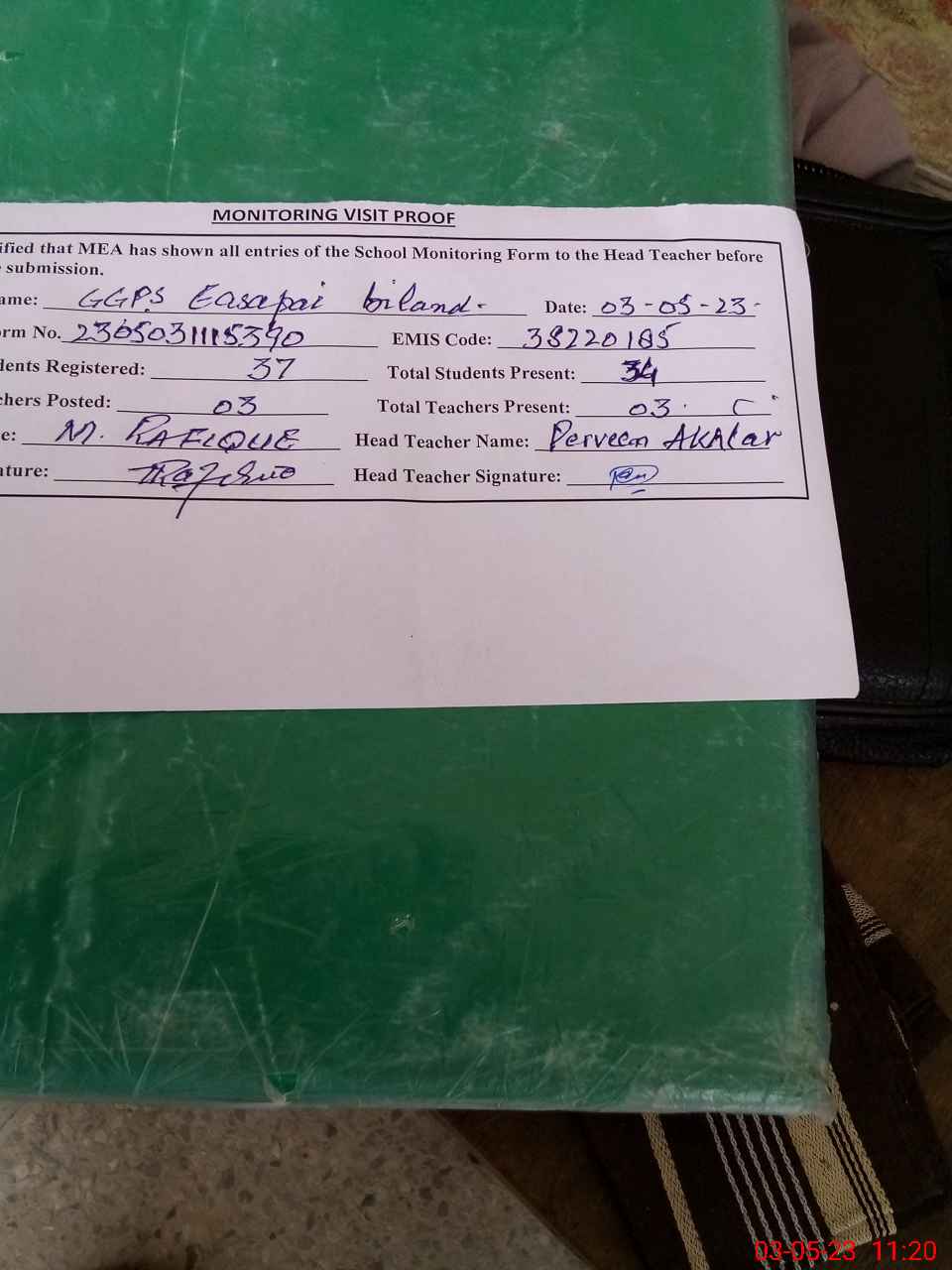 | Attendance Register | Head Teacher | MEA with School | Visit Proof |