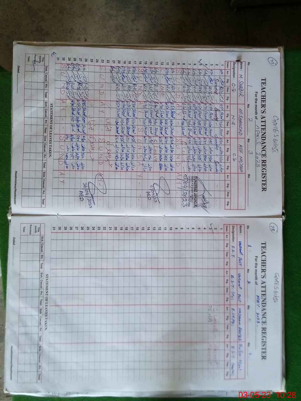 | Remarks (Use Separate Page if Required): EST Rafia Afzal absent since 9th January 2023 PST Mukhtaran Bibi absent today no leave sanctioned NSB record register not updated for the month of April 2023 and bank account statement for the month of April 2023 also not available | |||||