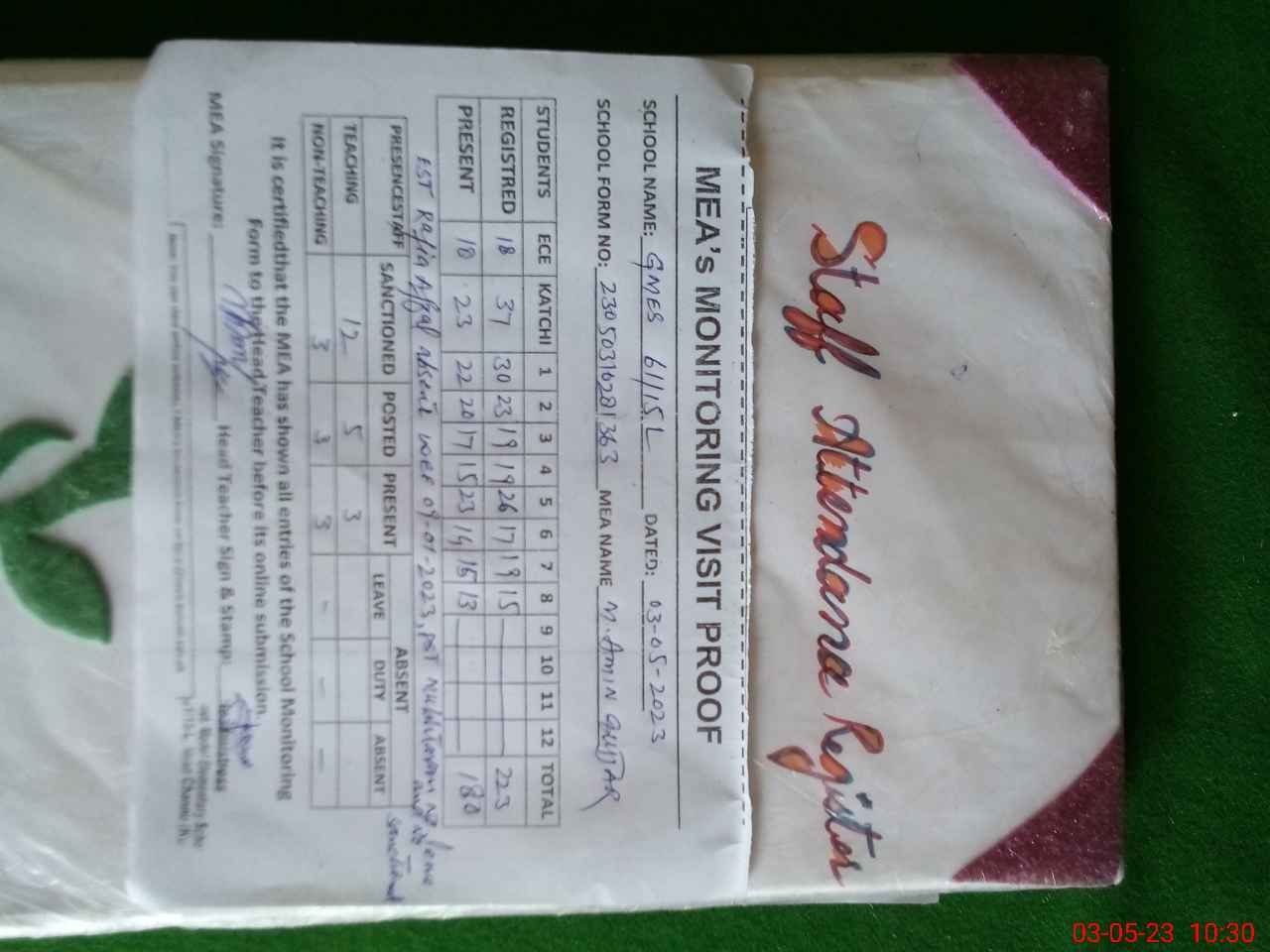 | Attendance Register | Head Teacher | MEA with School | Visit Proof |