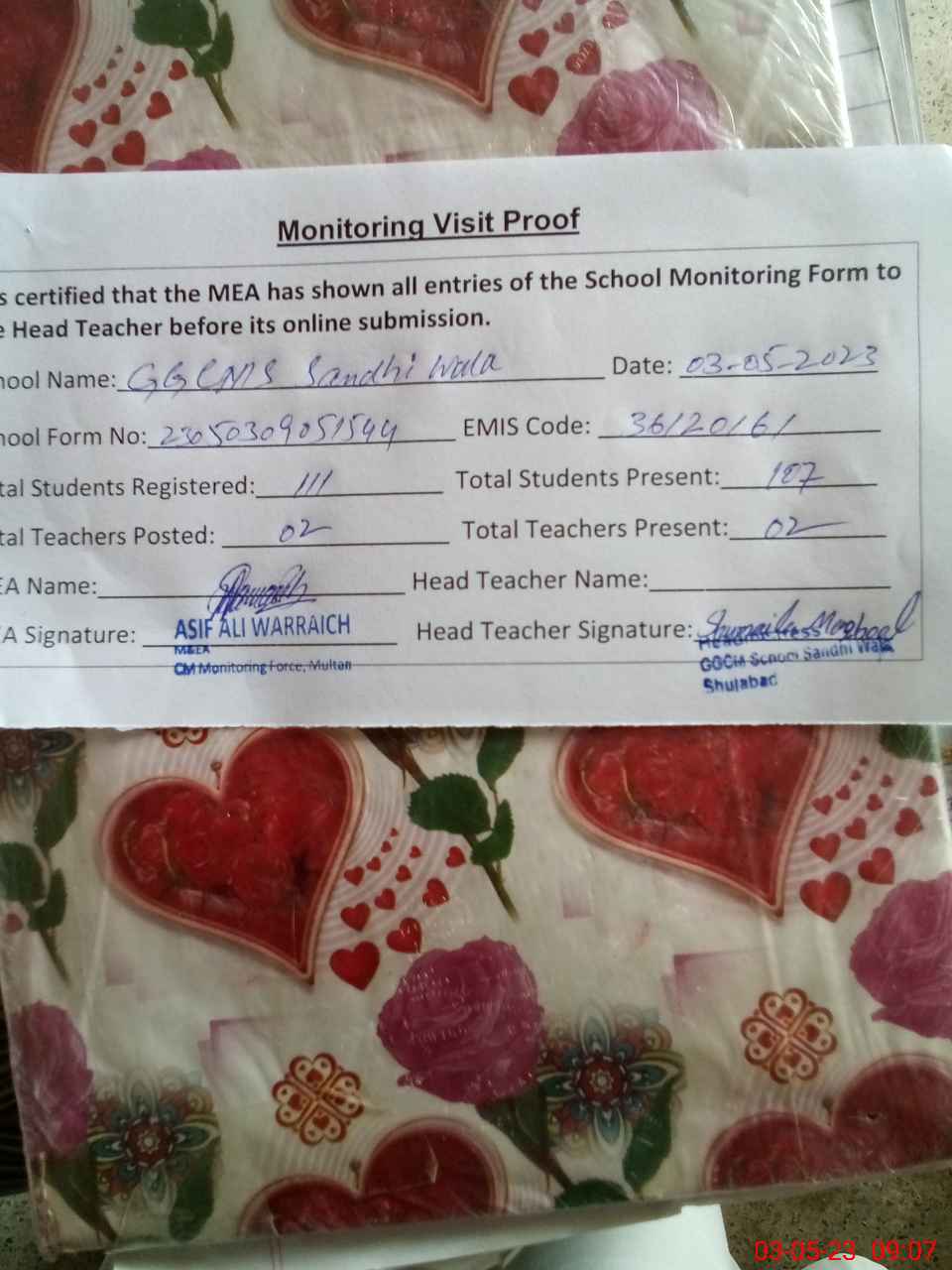 | Attendance Register | Head Teacher | MEA with School | Visit Proof |
