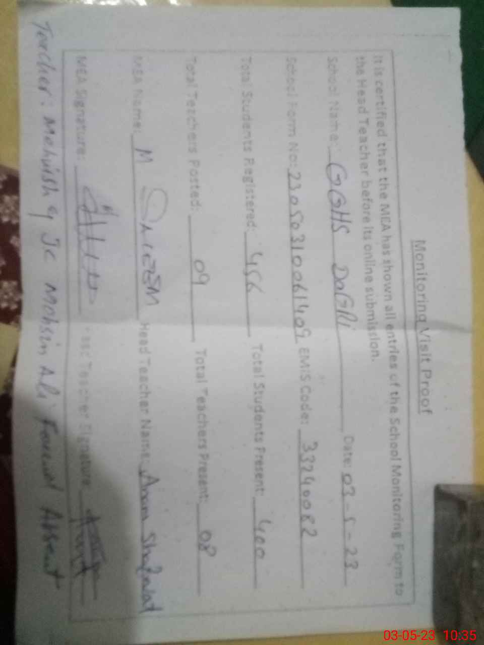 | Certified that this School was Inspected by the Undersigned MEA/DMO Today and the Information Stated Above is as Per Record. | |||||