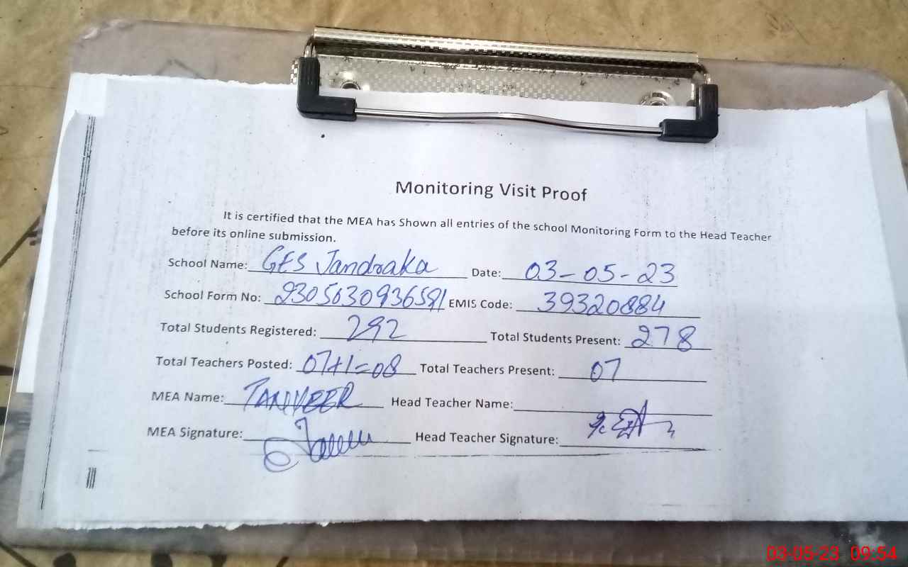 | Attendance Register | Head Teacher | MEA with School | Visit Proof |