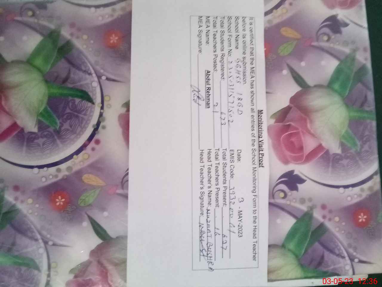 | Attendance Register | Head Teacher | MEA with School | Visit Proof |