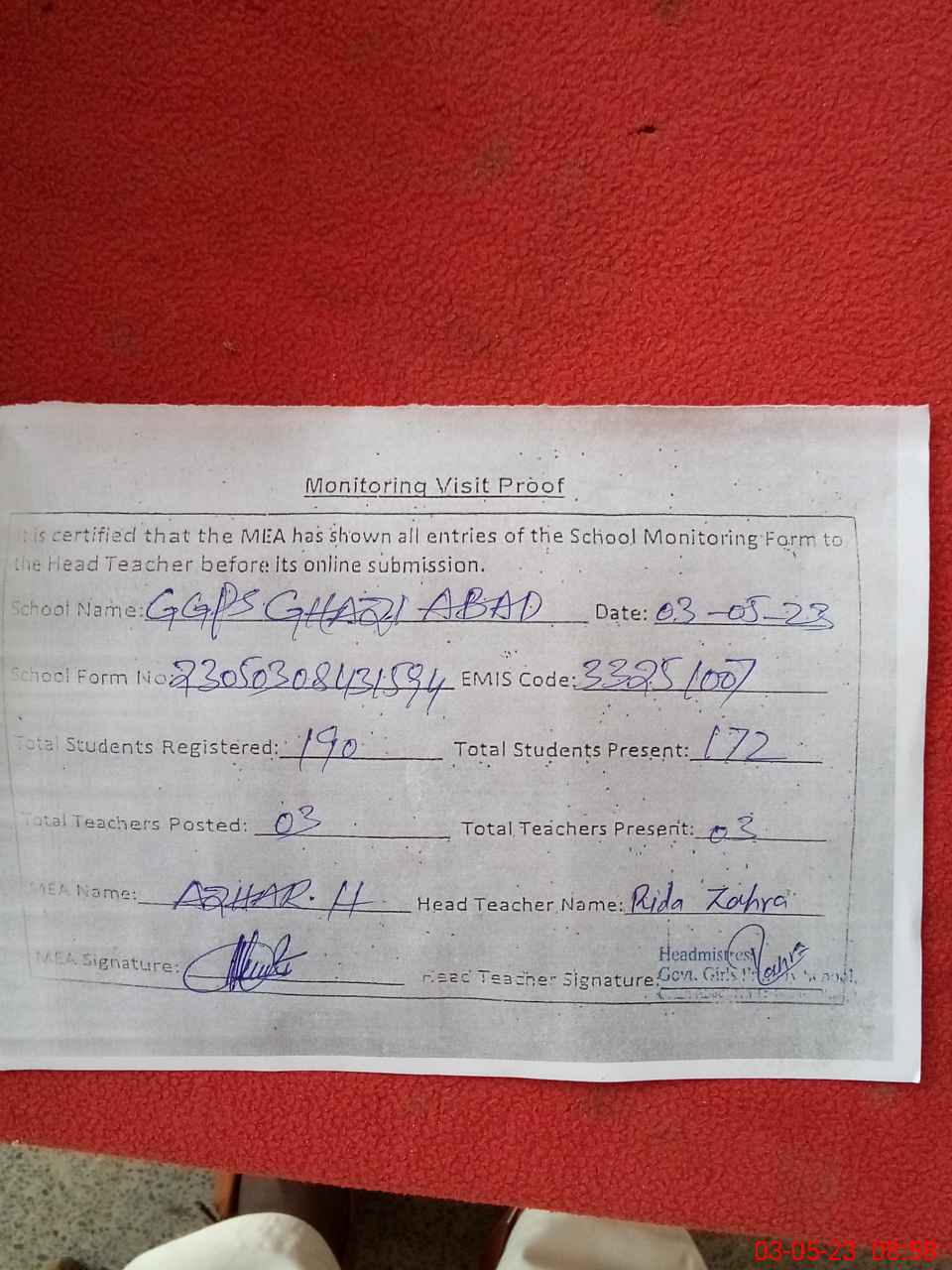 | Attendance Register | Head Teacher | MEA with School | Visit Proof |
