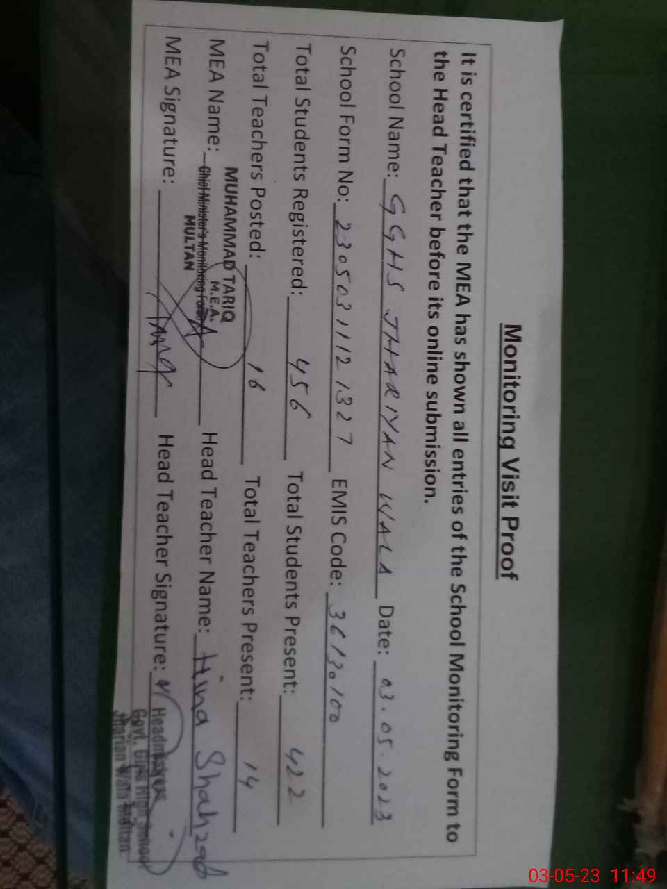 | EMIS Code: 36130100 | Name of School: GGHS JHARIYAN WALA MOUZA MADINA MULTAN | |||