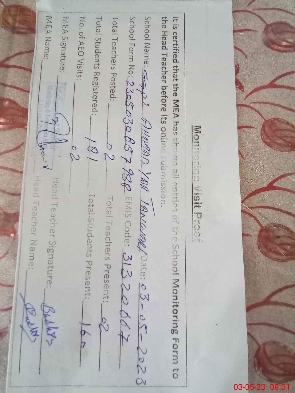 | EMIS Code: 31320667 | Name of School: GGPS AHMED YAR TANWARI QADEEM | |||