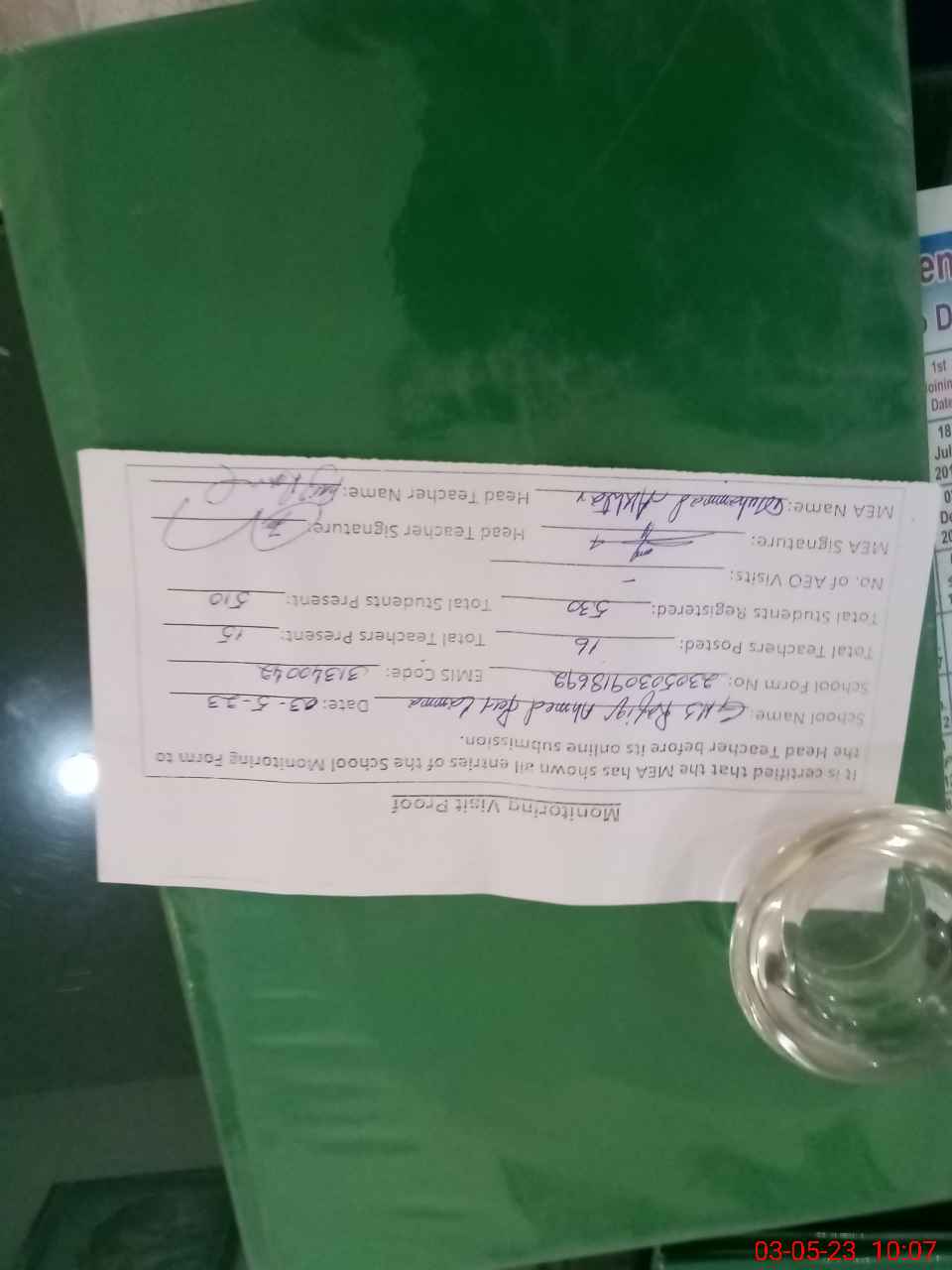 | Attendance Register | Head Teacher | MEA with School | Visit Proof |