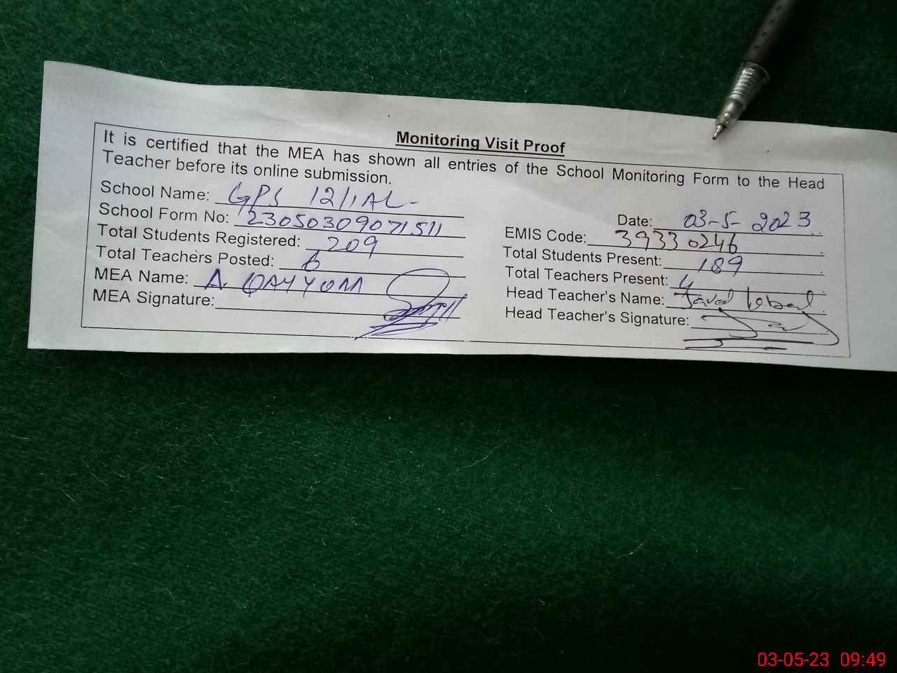 | Attendance Register | Head Teacher | MEA with School | Visit Proof |