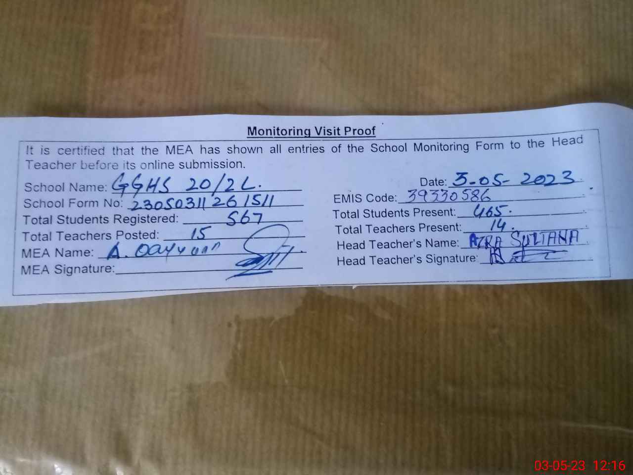 | Attendance Register | Head Teacher | MEA with School | Visit Proof |