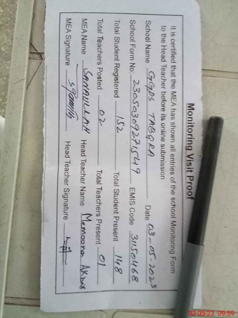 | Attendance Register | Head Teacher | MEA with School | Visit Proof |