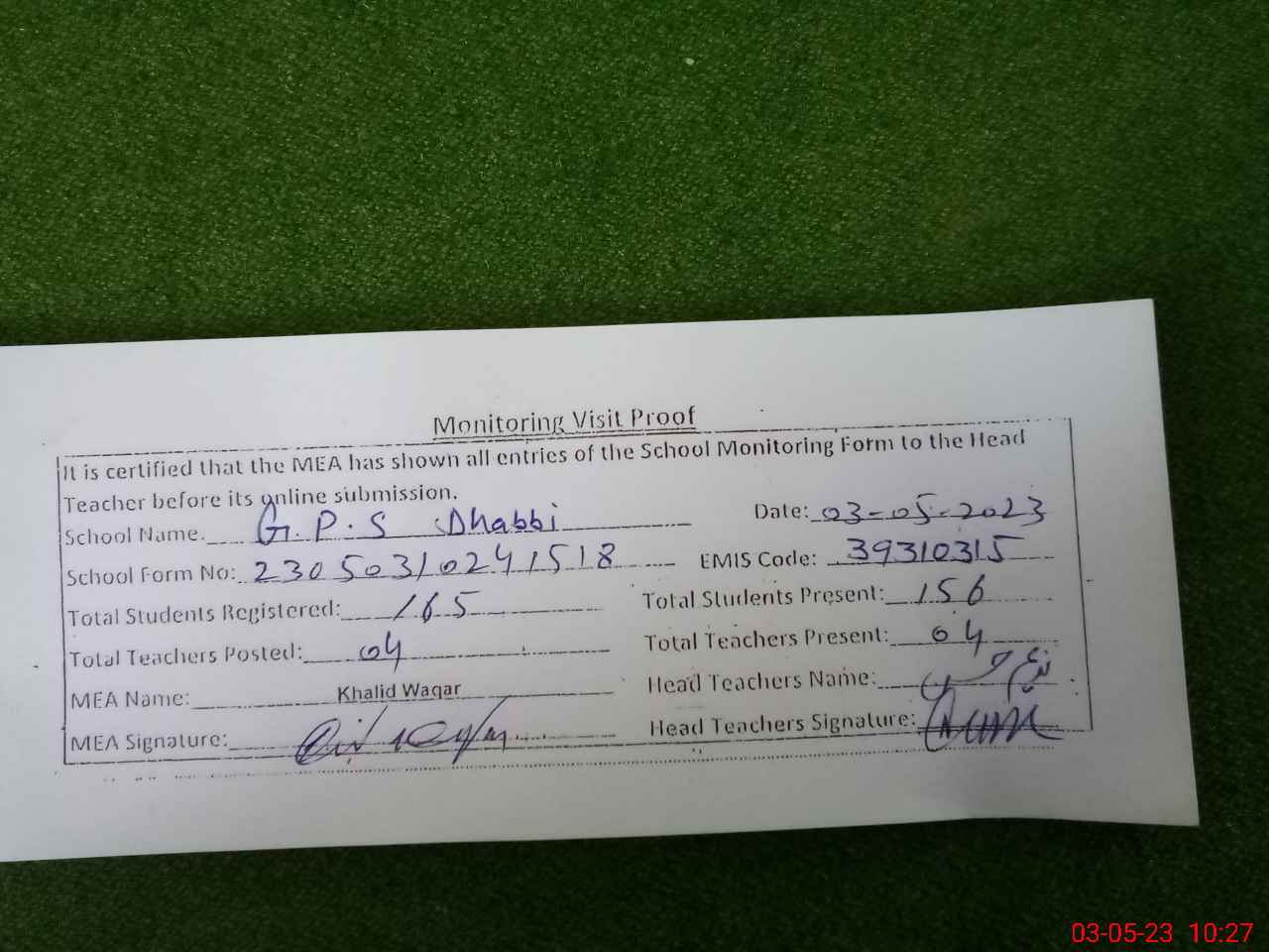 | EMIS Code: 39310315 | Name of School: GPS DHABBI | |||