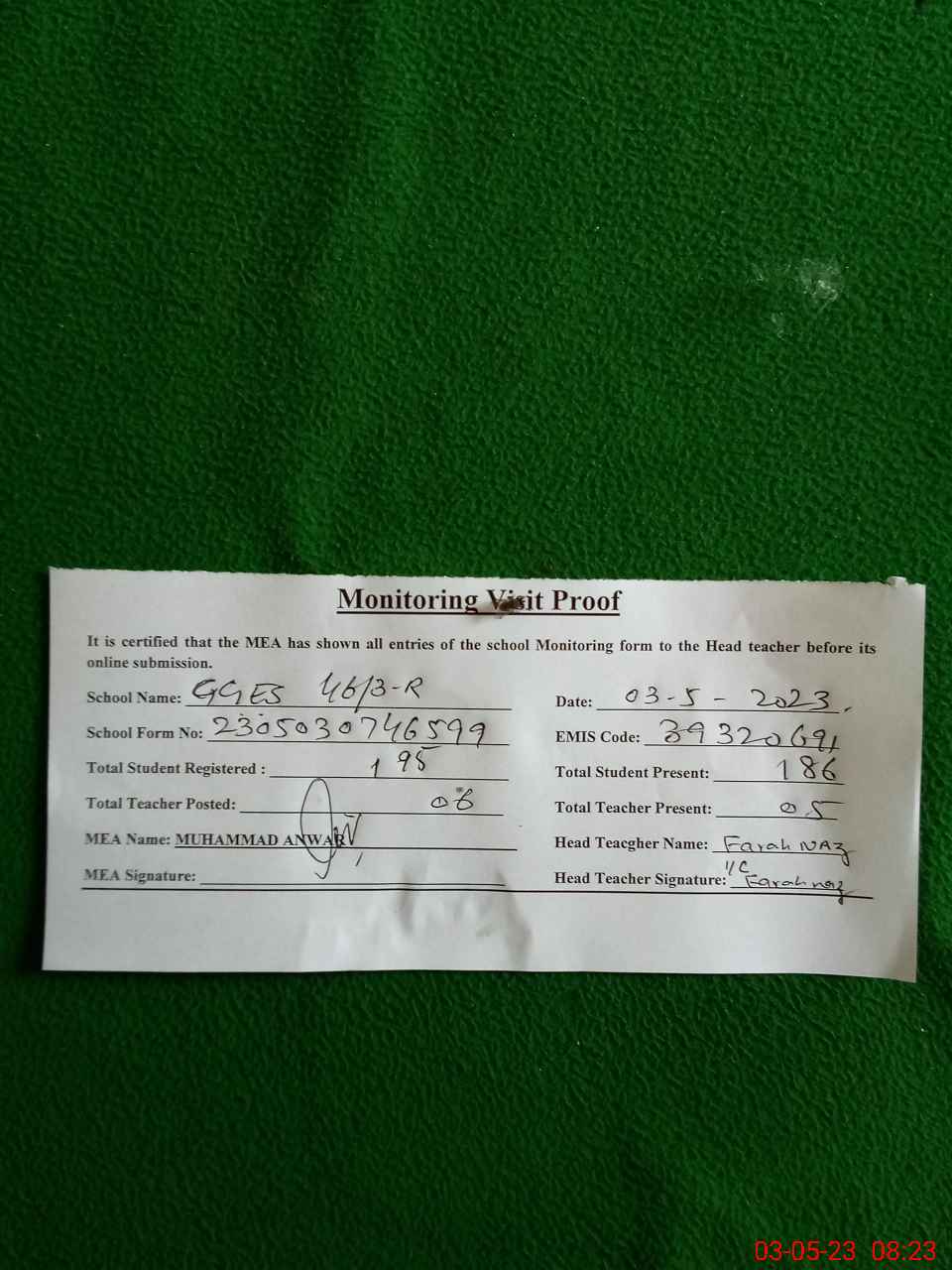 | Attendance Register | Head Teacher | MEA with School | Visit Proof |