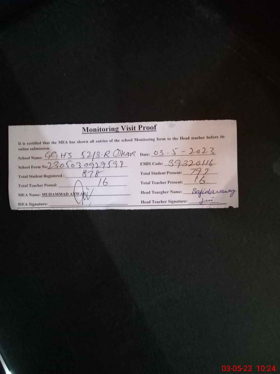 | Attendance Register | Head Teacher | MEA with School | Visit Proof |