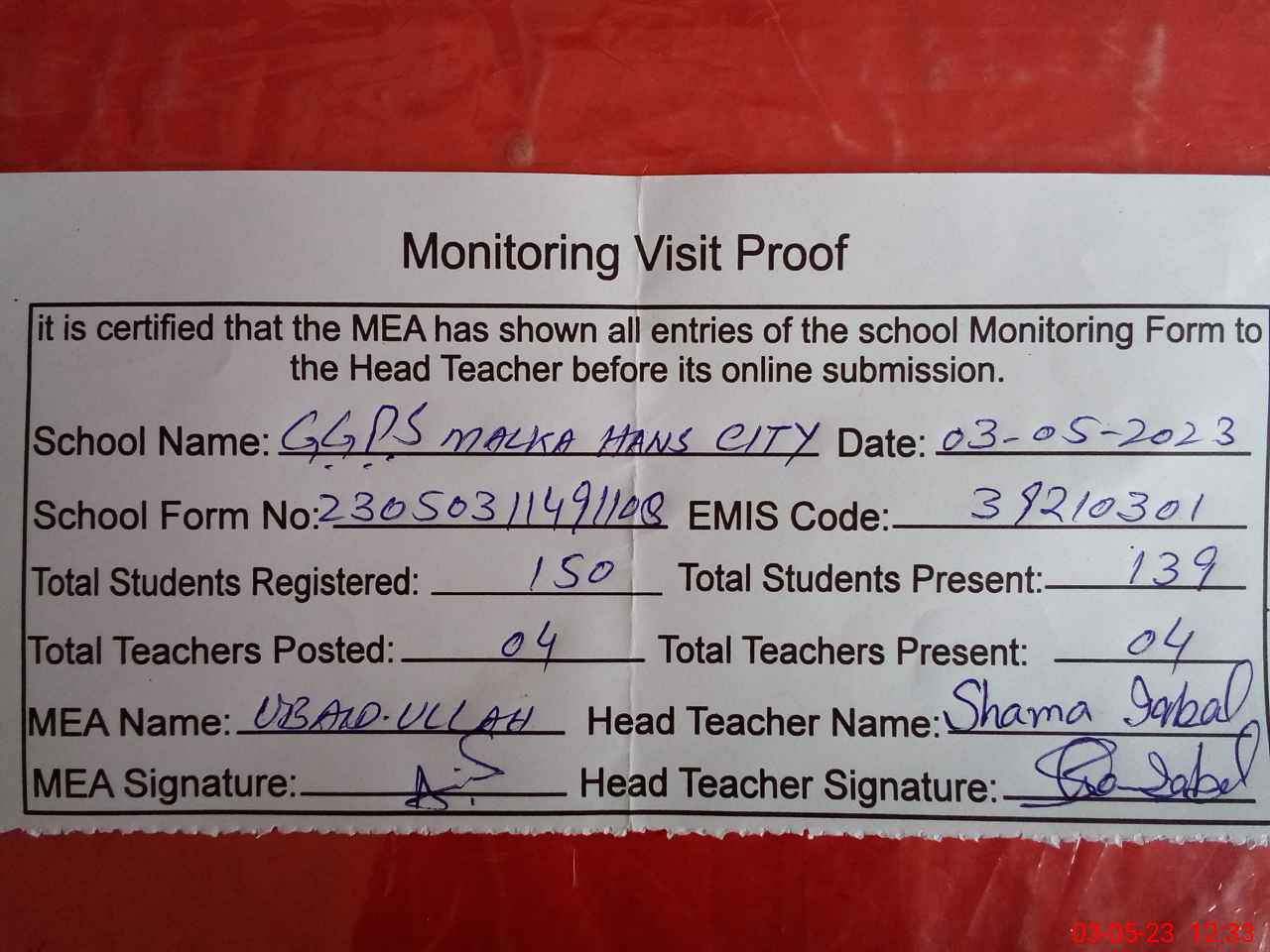 | EMIS Code: 39210301 | Name of School: GGPS MALKA HANS CITY | |||